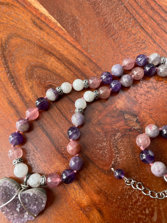 Self-Love Divine Feminine Heart Necklace with Amethyst, Strawberry Quartz, Unicorn Stone, & Moonstone