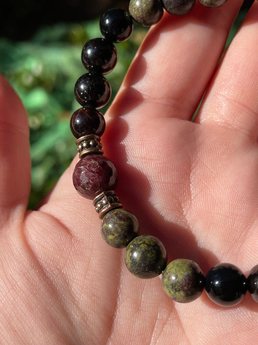 Masculine Inner Strength Crystal Bracelet with Garnet, Black Onyx, & Dragon Bloodstone