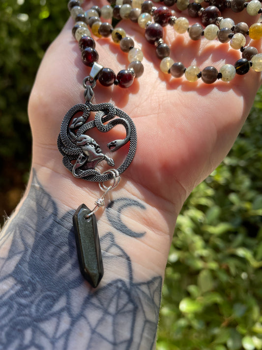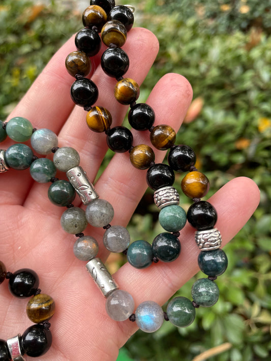 Protection- Tigers Eye, Onyx, & Snowflake Obsidian Crystal Beaded Mala Necklace