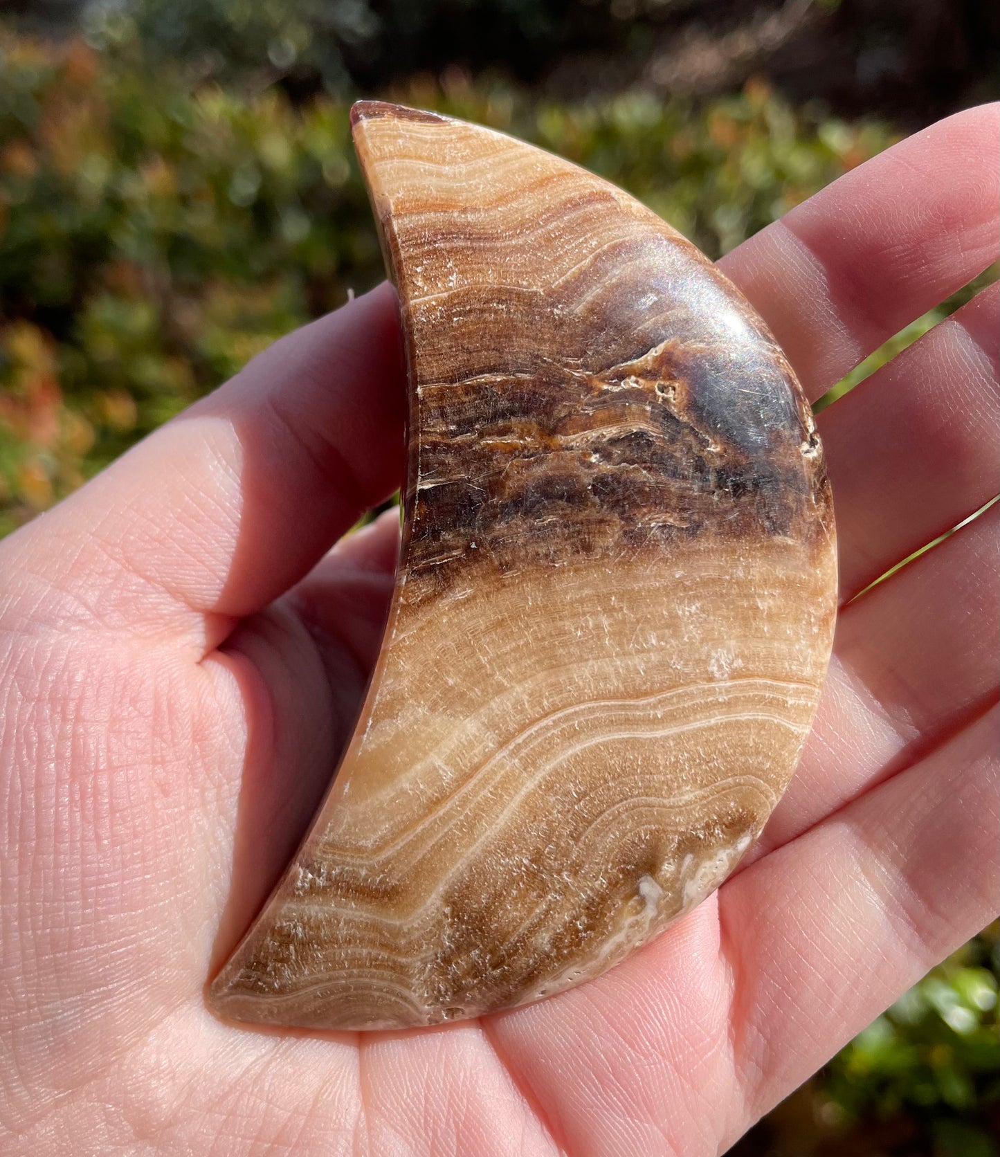 Chocolate Calcite Crystal Moon Carving. This crystal weighs 3 oz and is 3” tall and 1.25” wide.