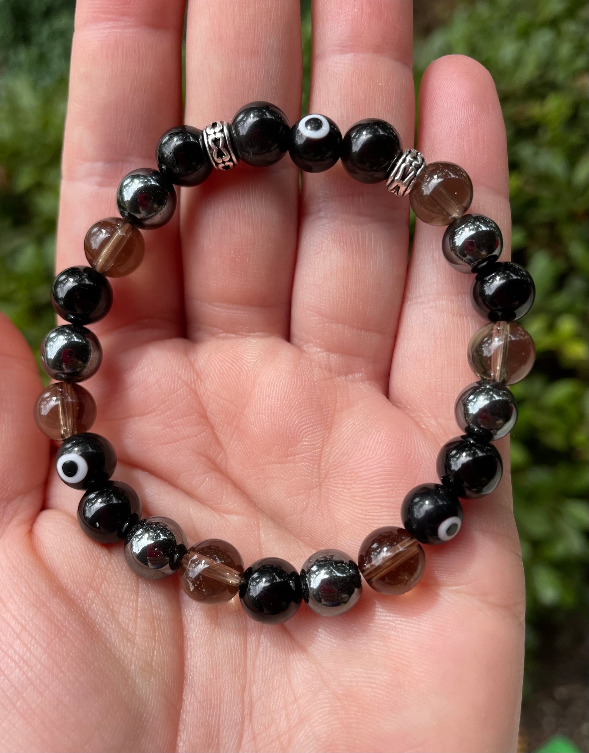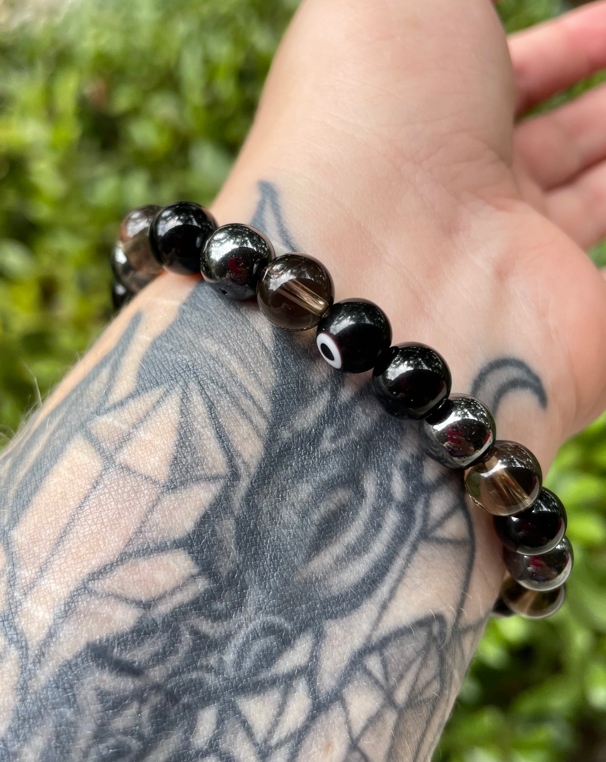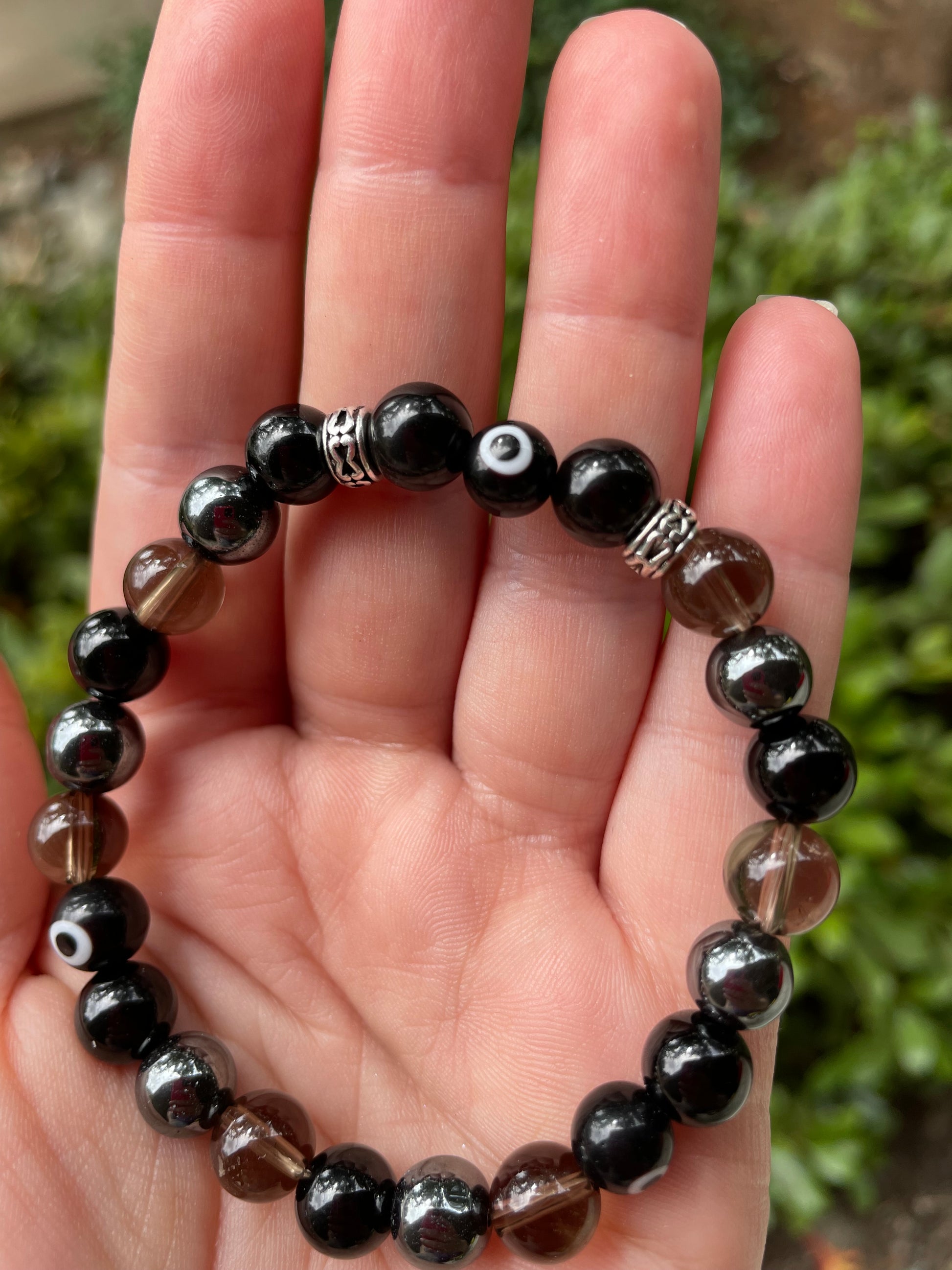 This powerful bracelet has four protective & grounding stones: smokey quartz, hematite, black tourmaline, and silver sheen obsidian. There are also some black glass Nazar (evil eye protection) beads.