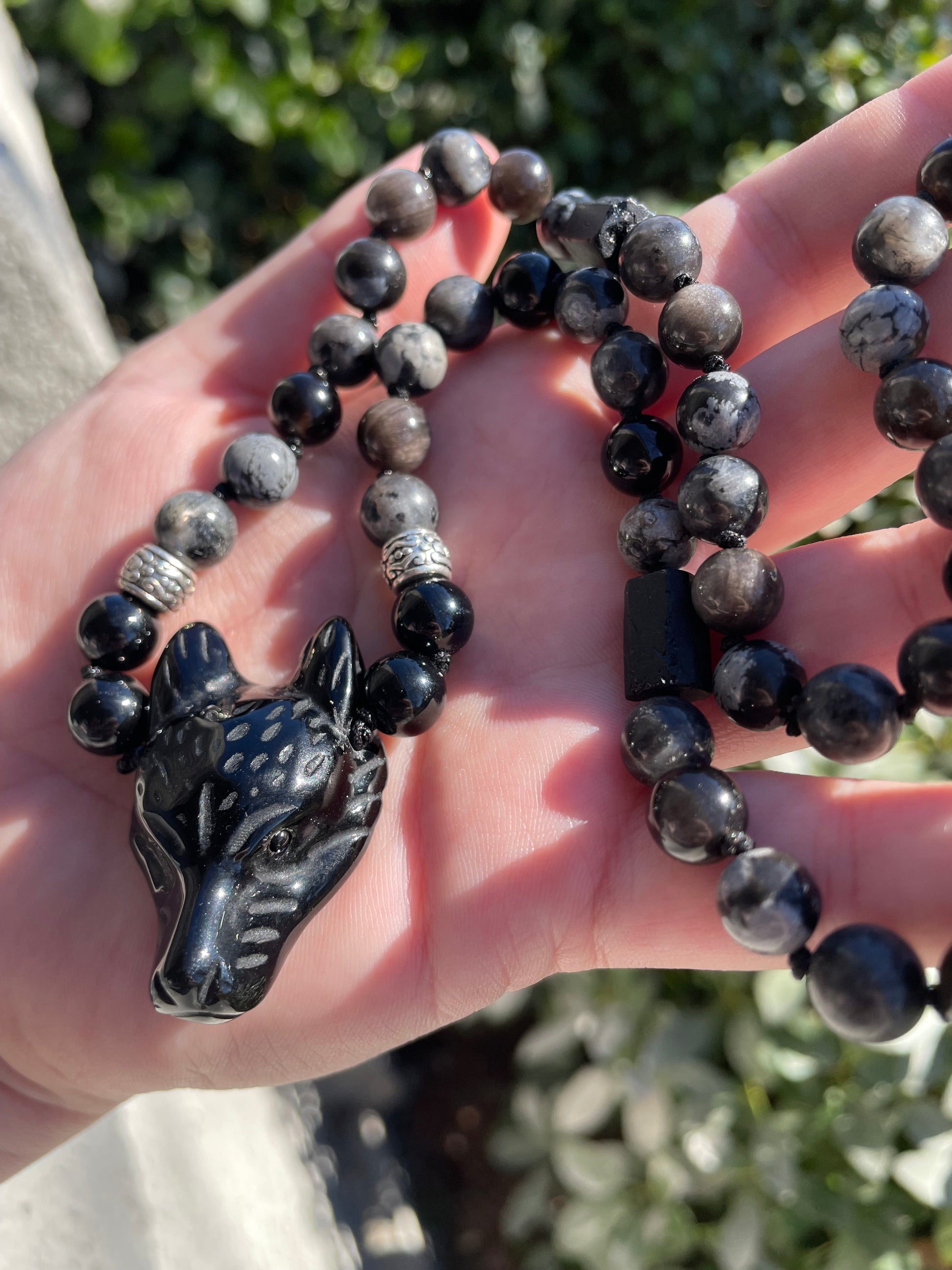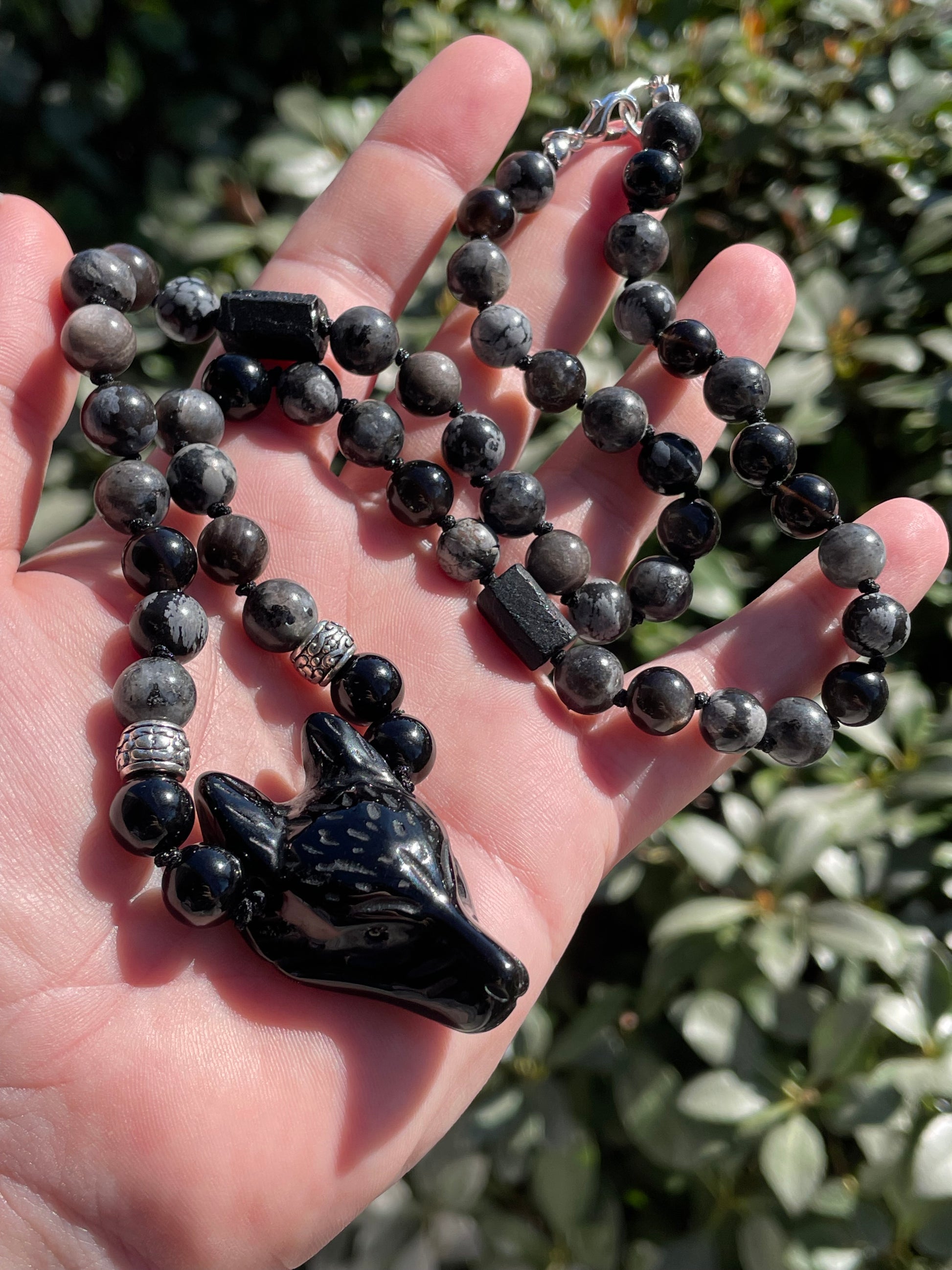 The stones I chose are an obsidian wolf, black tourmaline, silver sheen obsidian, larvikite, and snowflake obsidian. The necklace is approximately 10” long and mid chest length for most people. Each bead is hand knotted with protective intention.
