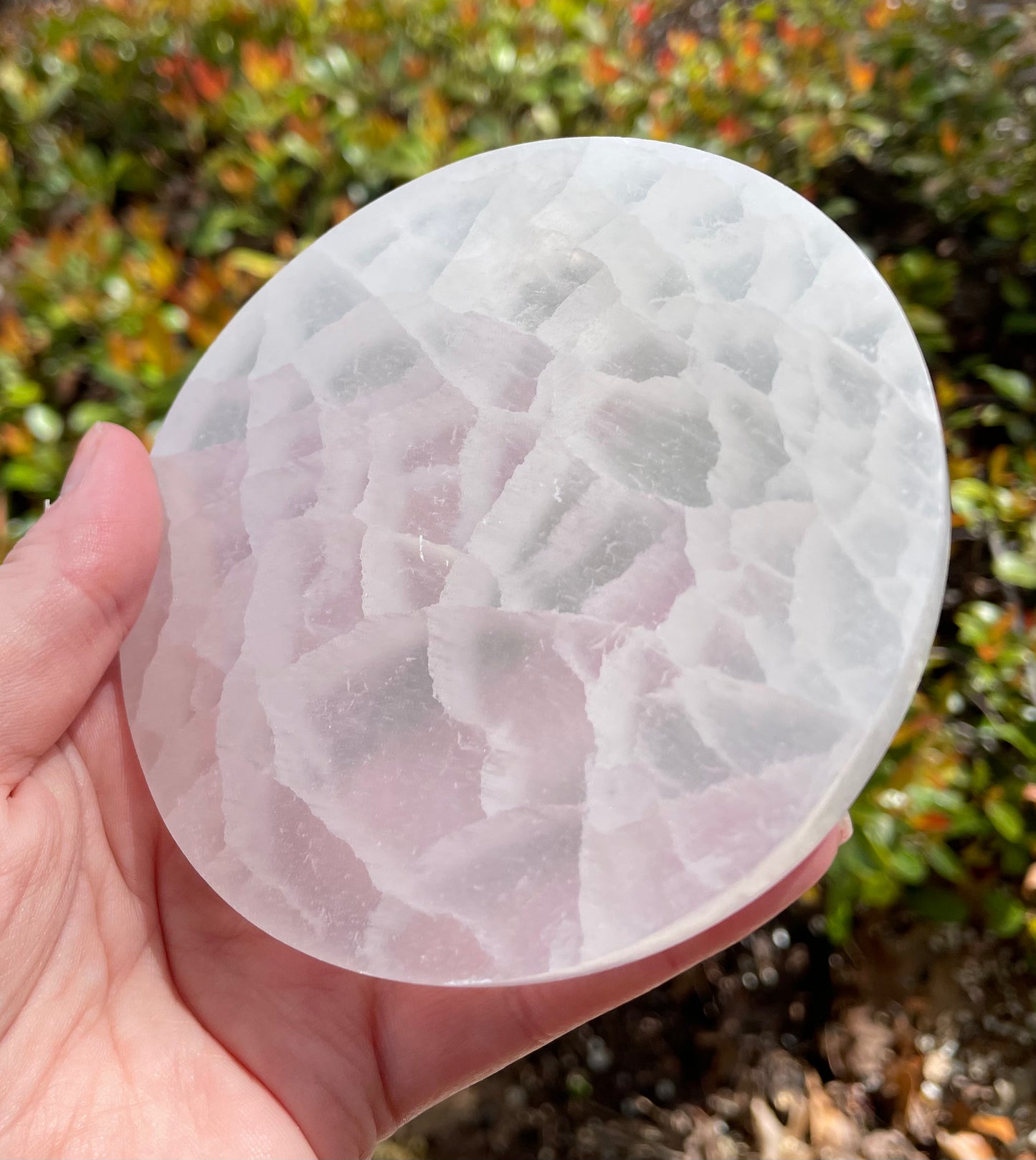 Beautiful round Satin Spar selenite Crystal charging plate. This is perfect for charging crystals, as selenite cleanses the energy of the crystals and people around it.